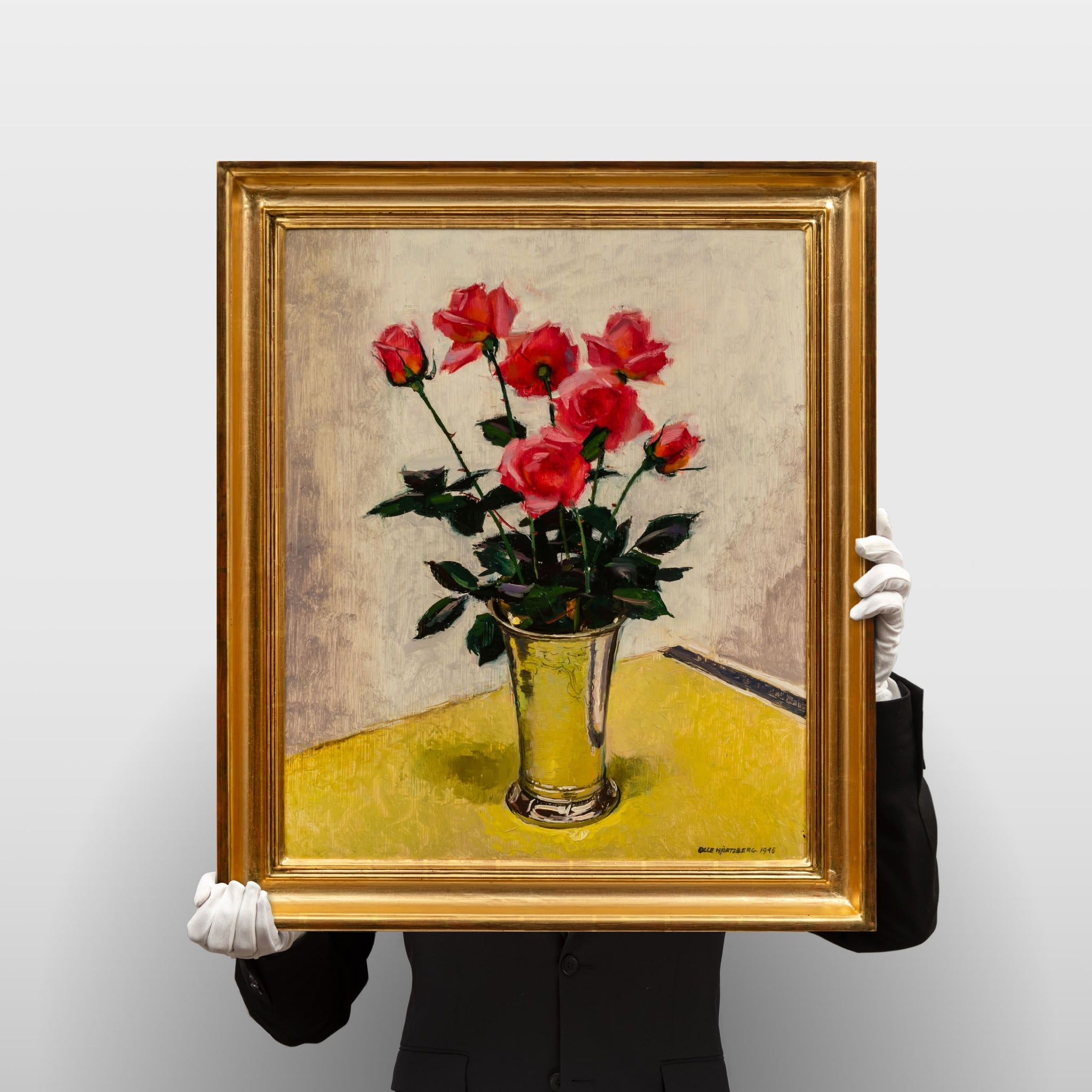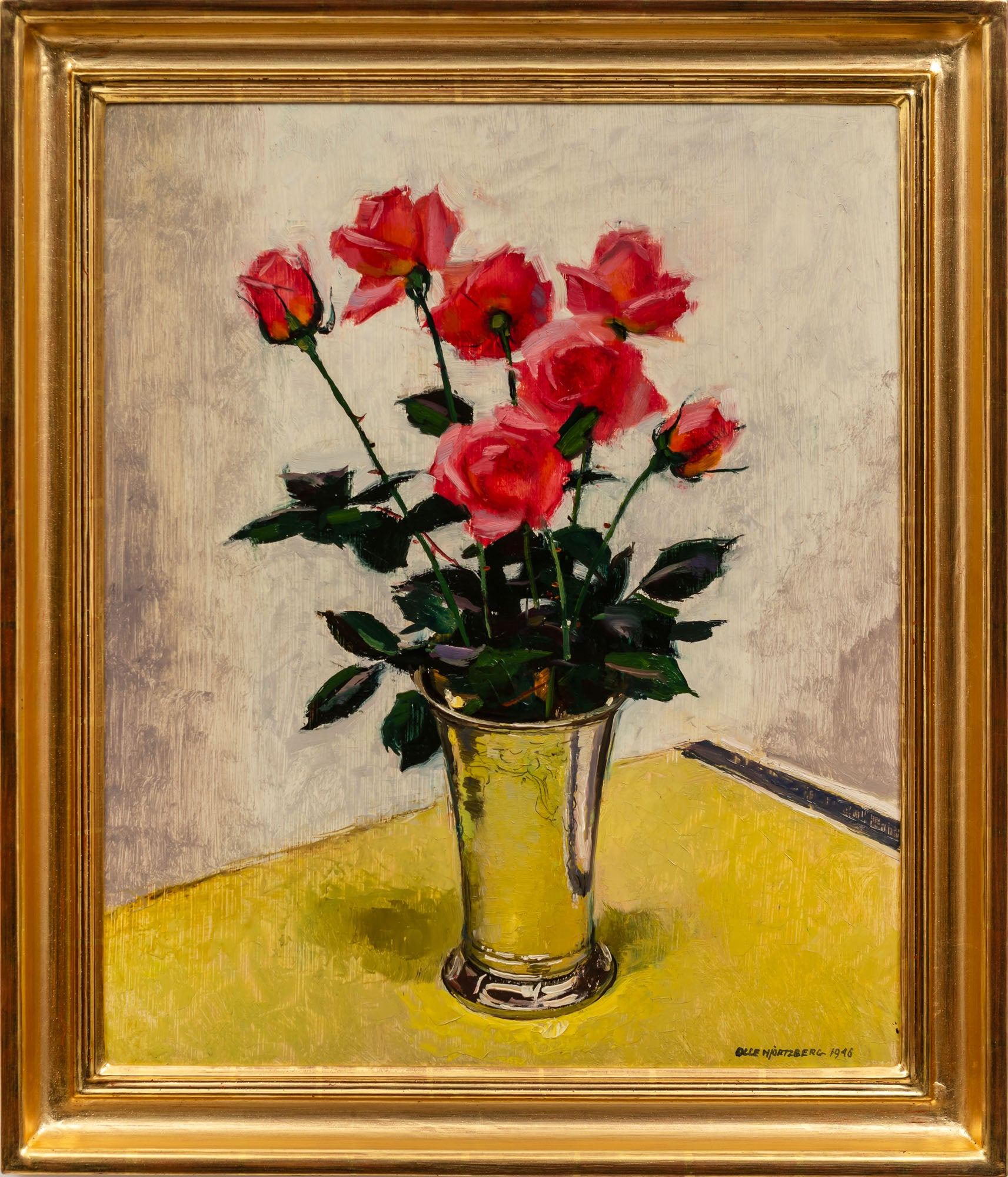 Olle Hjortzberg (1872-1959) växte upp i Linköping innan han 1886 flyttade till Stockholm och några år senare började som lärling för sin svåger, illustratören Agi Lindegren. År 1892-1893 medverkade Olle Hjortzberg vid utsmyckningen och dekoreringen av Uppsala Domkyrka. Han studerade på Kungliga Konsthögskolan innan stipendiemedel möjliggjorde en flerårig studieresa genom Frankrike, Italien, Grekland och Palestina. Efter sin återkomst till Sverige 1905 följde många uppdrag inom kyrkomåleri och byggnadsdekoration. Bland annat 28 målningar i Klara kyrka, Dramatens restaurang, Rådhuset och Tekniska högskolan i Stockholm. Olle Hjortzberg var även professor vid Konsthögskolan och som grafiker utförde han många frimärken och bl.a. affischen till Olympiska sommarspelen i Stockholm 1912. Olle Hjortzberg kombinerade gärna traditionella inslag och stildrag i ett samtidigt modernt formspråk. Gärna i en monumental och lite sträng stilisering med tydlig inspiration av assyrisk konst och symbolik. Olle Hjortzberg är representerad vid bl.a. Nationalmuseum, Moderna museet och Norrköpings konstmuseum.