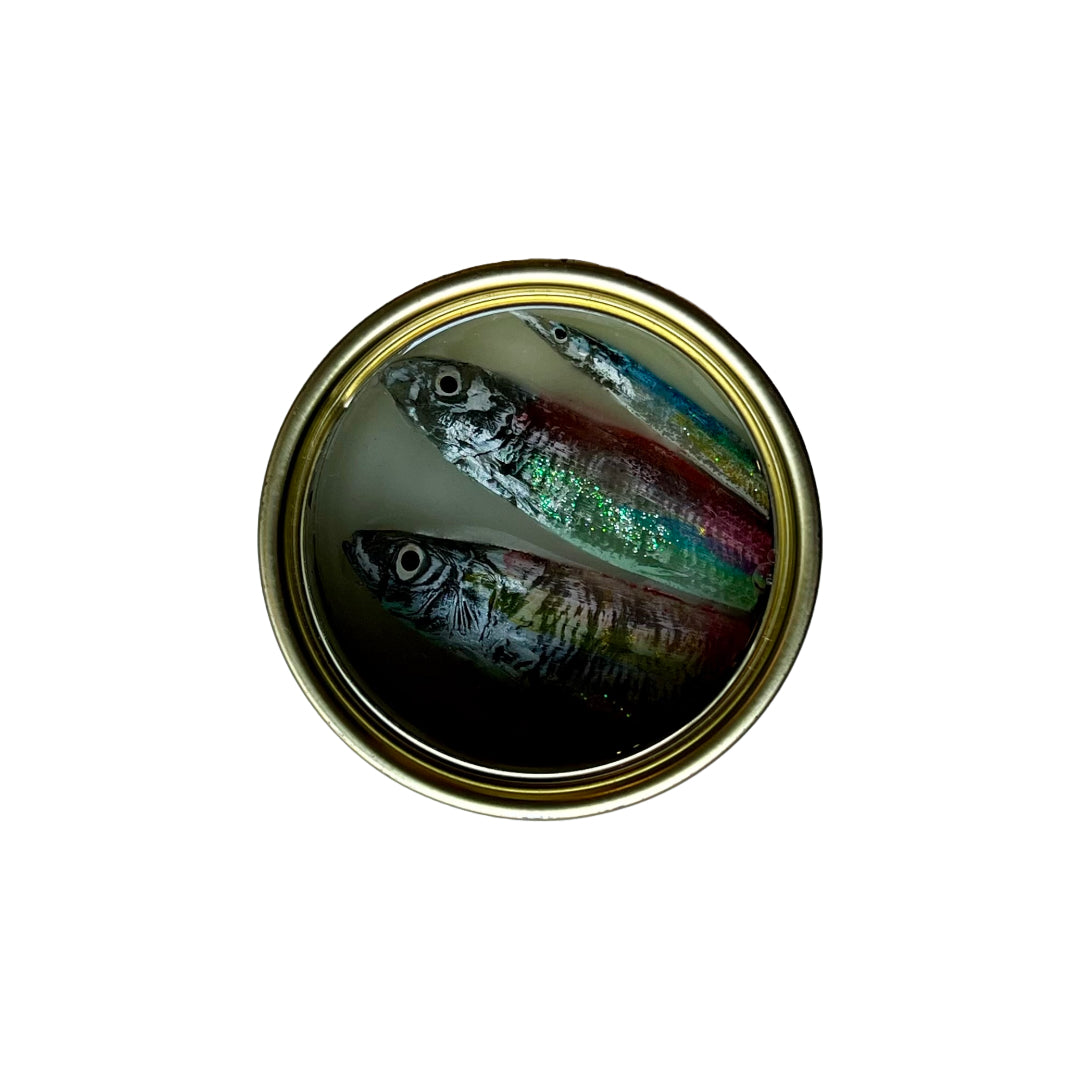 Material: Pigment, paraffin, harts, äkta sardinburkar