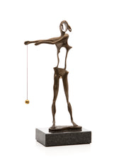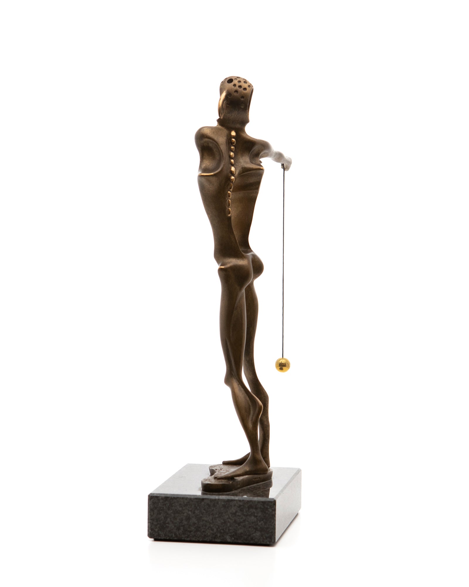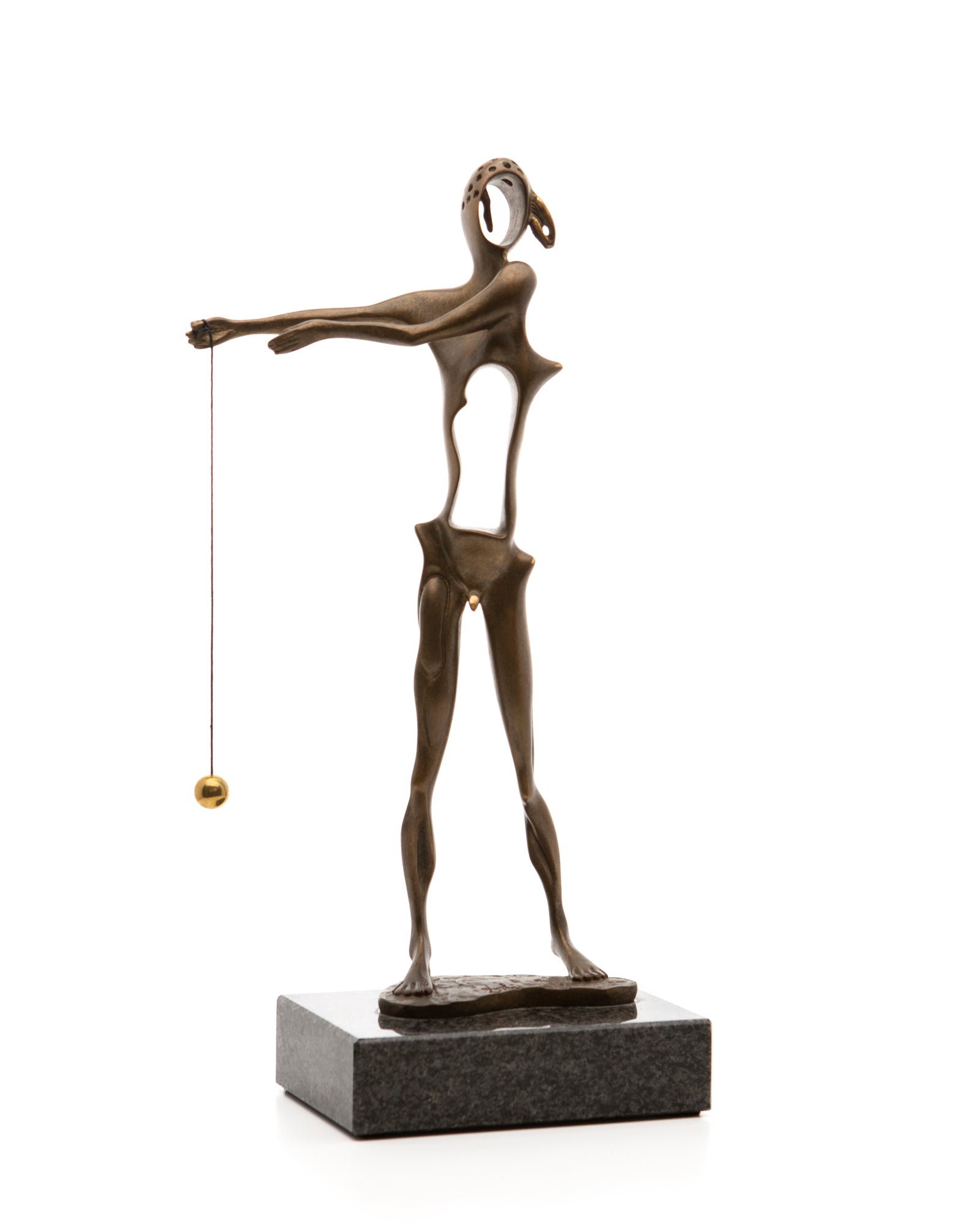 Salvador Dalí ärar här den engelska matematikern Isaac Newton som så berömt upptäckte gravitationslagen när ett äpple föll ner på hans huvud. I denna skulptur öppnar konstnären upp figuren med mycket rymd och porträtterar avsaknaden av Newtons vitala organ samtidigt som det ihåliga huvudet symboliserar ett öppet sinne. Dalí implicerar att Newton har blivit blott ett namn, helt fråntagen sin personliga identitet och individualitet. Konstnären var besatt av kontrasten mellan mjukt och hårt och visar här benen som sticker ut genom att invertera anatomin på figuren. En oerhört fascinerande och surrealistisk homage till en av världshistoriens största vetenskapsmän.