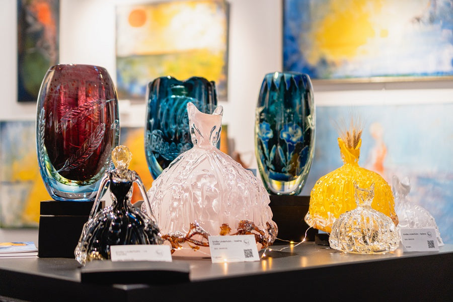Emilia Linderholm bjuder dig in till att drömma om romantik, vackra vidder och en festlig vardag genom hennes färgstarka konstverk och liv. Kvinnorna i verken gestaltar livets alla känslor i sprakande färger och påminner oss om gudinnor som utstrålar både styrka och sårbarhet. Ljusspelet i glasklänningarna reflekterar passionen i en livfull dans. Kylan och hettan i perfekt samspel förvandlar sand och glasmassa till berättelser om prinsessor på bal bland puffiga, feminina klänningar. En scenografisk komposition med ursprung i Emilias egen bakgrund som operasångerska. Titlarna på verken är ofta inspirerade av dikter och lyrik. Emilias konstnärliga vision är att kombinationen av verket och titeln kan tala till dig som betraktare, just där du är i livet.