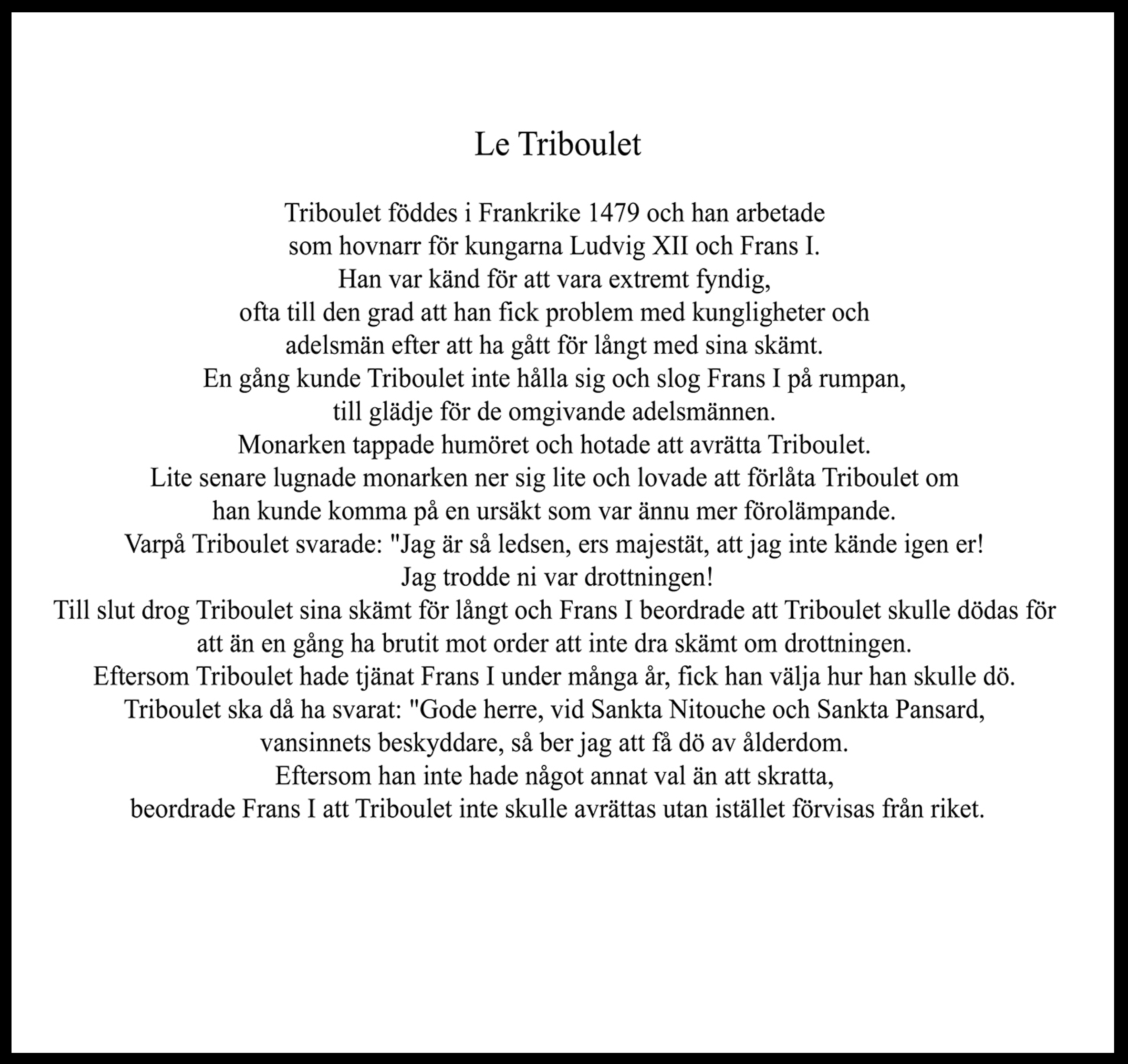 "Triboulet föddes i Frankrike 1479 och han arbetade som hovnarr för kungarna Ludvig XII och Frans I. Han var känd för att vara extremt fyndig, ofta till den grad att han fick problem med kungligheter och adelsmän efter att ha gått för långt med sina skämt. En gång kunde Triboulet inte hålla sig och slog Frans I på rumpan, till glädje för de omgivande adelsmännen. Monarken tappade humöret och hotade att avrätta Triboulet. Lite senare lugnade monarken ner sig lite och lovade att förlåta Triboulet om han kunde komma på en ursäkt som var ännu mer förolämpande. Varpå Triboulet svarade: "Jag är så ledsen, ers majestät, att jag inte kände igen er! Jag trodde ni var drottningen! Till slut drog Triboulet sina skämt för långt och Frans I beordrade att Triboulet skulle dödas för att än en gång ha brutit mot order att inte dra skämt om drottningen. Eftersom Triboulet hade tjänat Frans I under många år, fick han välja hur han skulle dö. Triboulet ska då ha svarat: "Gode herre, vid Sankta Nitouche och Sankta Pansard, vansinnets beskyddare, så ber jag att få dö av ålderdom. Eftersom han inte hade något annat val än att skratta, beordrade Frans I att Triboulet inte skulle avrättas utan istället förvisas från riket."