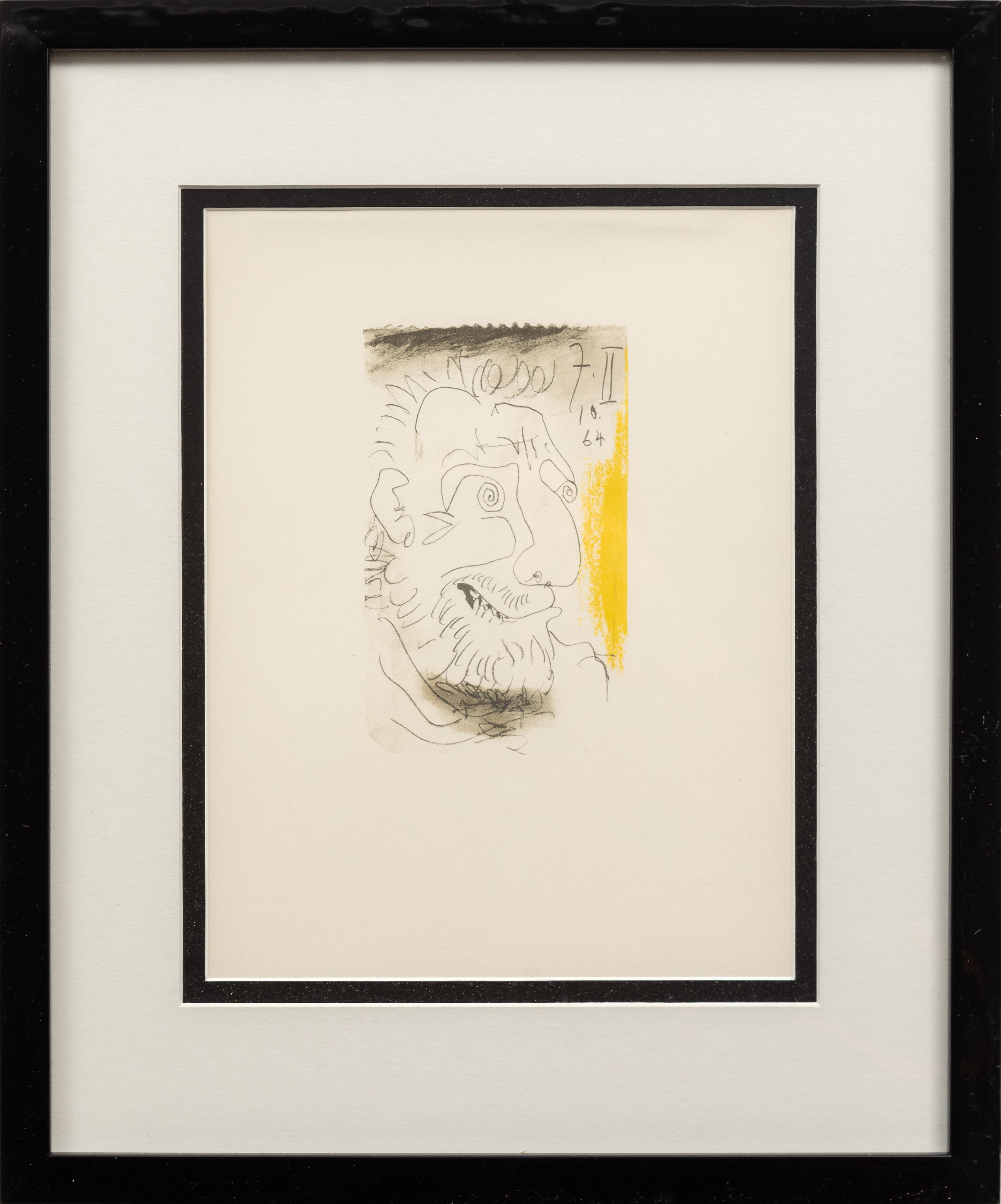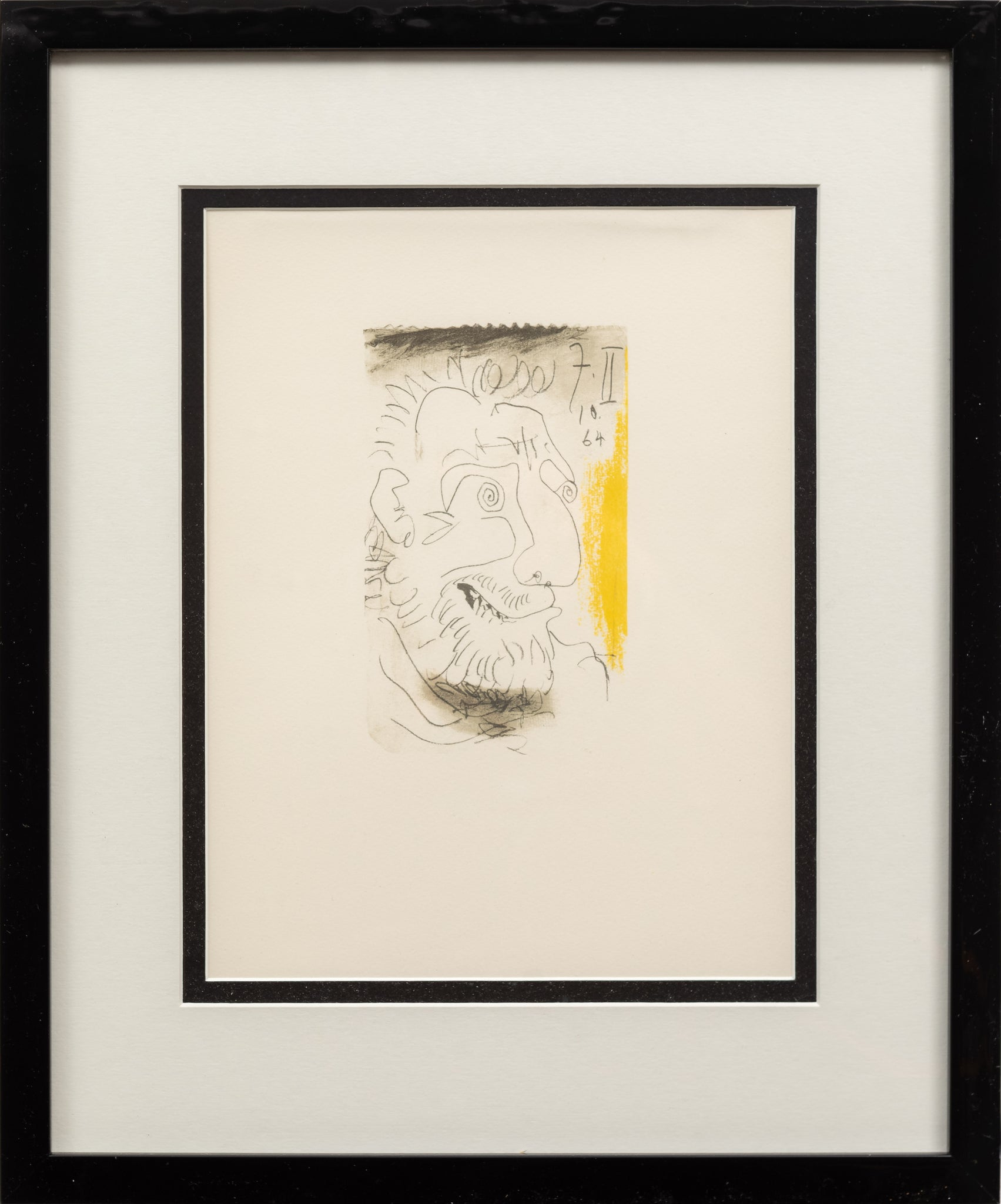 Mappen Le Goût du Bonheur består av 71 litografier baserade på originalteckningar av Picasso, tryckta på Arches-papper. Upplagan är totalt 1998 exemplar, uppdelad i tre parallella, separata upplagor om 666 exemplar vardera, tryckta av olika utgivare. Denna specifika litografi är från den tyska utgåvan, numrerad som exemplar 34 och utgiven av Carl Schünemann Verlag, Bremen. Verket trycktes 1970 och är daterat 3.5.64 i trycket.