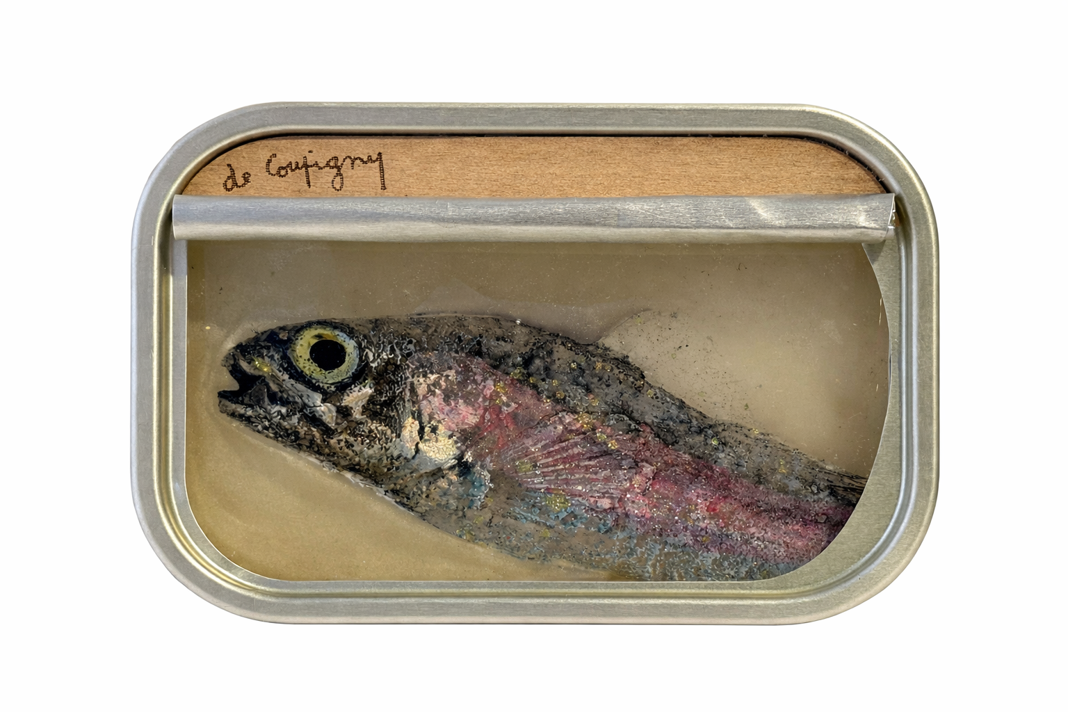 He exhibited at the Royal Academy of London in 2008 and now has galleries showing his work in France, Holland, the UK and Switzerland. Ortaire uses intense pigments to create his unique painted fish before suspending them in paraffin and coating them with a transparent resin. Real sardine cans (made in his local area) are used to create an interesting dynamic between the industrial, mass-produced, everyday object and his hand-painted, unique and often humorous representations of the fish. Using his unusual technique, Ortaire aims to surprise and delight us with this unexpected marriage of the commercial and the artisan.