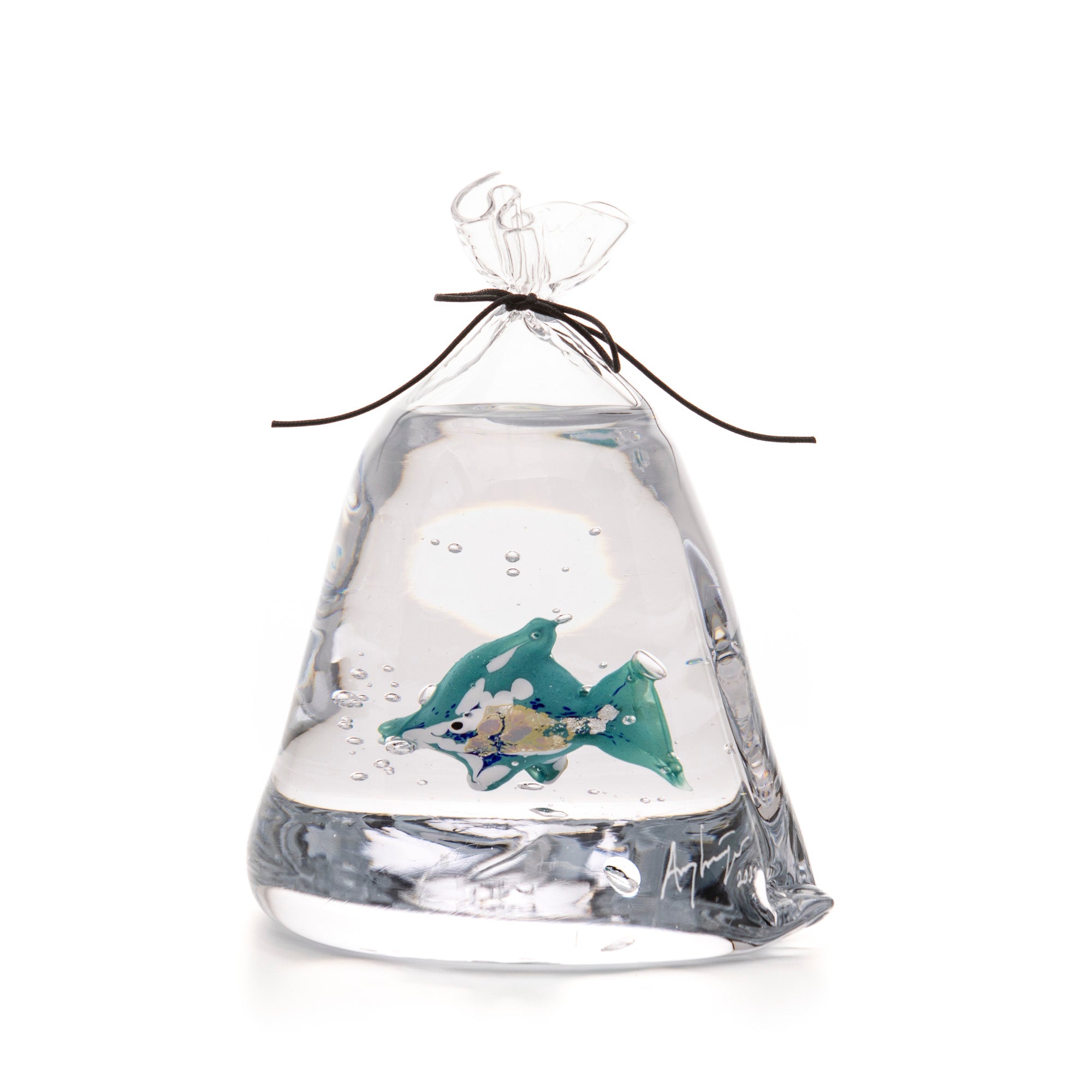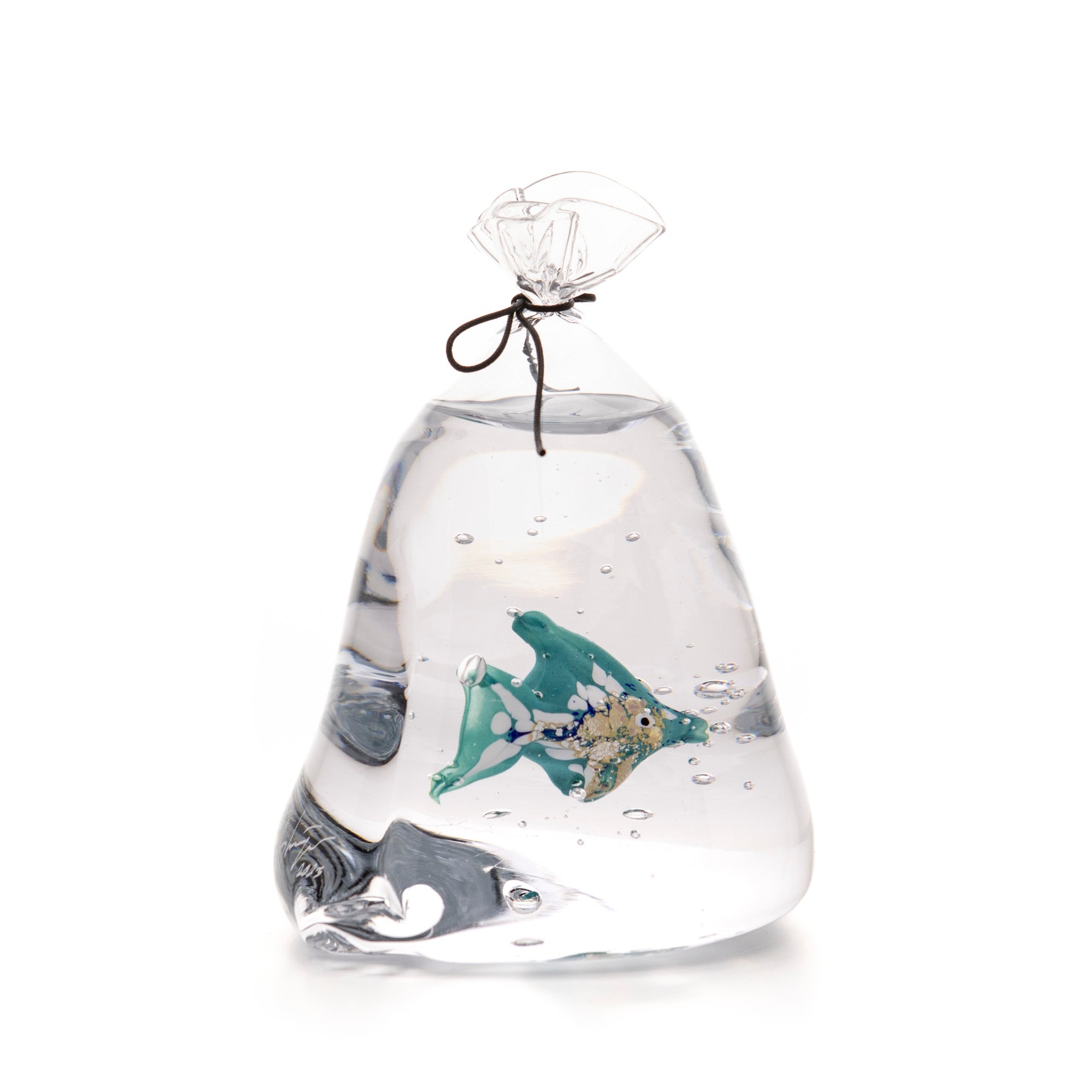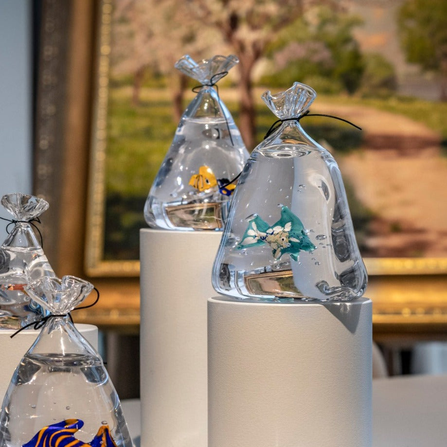 Amy om fiskpåsarna: "Fiskpåsarna kom från ett barndomsminne. Vi hade många guldfiskar och det var i en påse de kom i när de gjorde resan hem. Glaset har på många sätt likheter med vatten och för mig är det naturligt att använda glaset till att spegla andra element”.