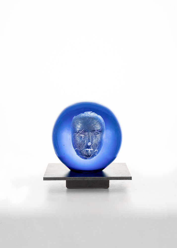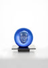 Headman Blue innesluten i sin värld, en slags glasets mindfulness. Stilla, seende med fokus på det som finns i just denna stund, i nuet. Ett form i klarglas med bladsilver blir ett ansikte som utgör kärnan av skulpturen. Skulpturen monteras på en sockel av järn med klack.