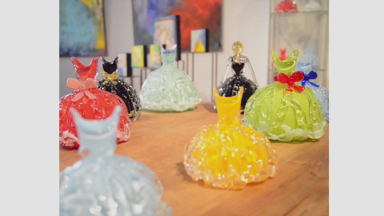 Emilia Linderholm bjuder dig in till att drömma om romantik, vackra vidder och en festlig vardag genom hennes färgstarka konstverk och liv. Kvinnorna i verken gestaltar livets alla känslor i sprakande färger och påminner oss om gudinnor som utstrålar både styrka och sårbarhet. Ljusspelet i glasklänningarna reflekterar passionen i en livfull dans. Kylan och hettan i perfekt samspel förvandlar sand och glasmassa till berättelser om prinsessor på bal bland puffiga, feminina klänningar. En scenografisk komposition med ursprung i Emilias egen bakgrund som operasångerska. Titlarna på verken är ofta inspirerade av dikter och lyrik. Emilias konstnärliga vision är att kombinationen av verket och titeln kan tala till dig som betraktare, just där du är i livet.